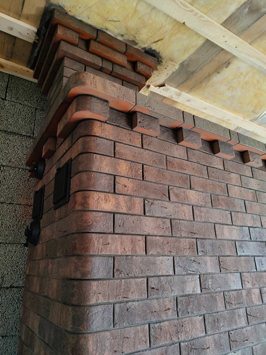 • Внешний контур и труба: 500 шт. тёмного печного кирпича «Гессен Вайн» КС-Керамик — глубокий шоколадный цвет с переливами, от сливового до светлых оттенков в зависимости от света.